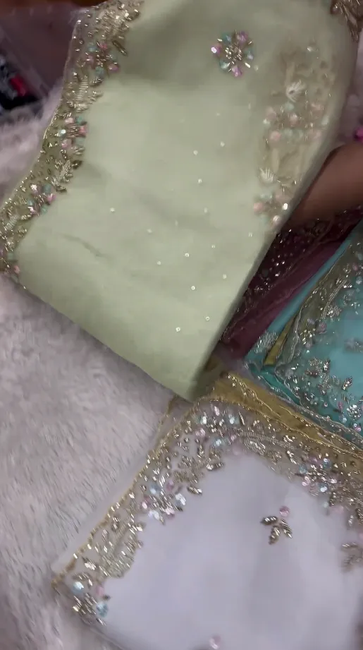 This organza saree is an ideal choice for Engagement parties, Sangeet nights, festive lunches, and garden-themed weddings. The combination of the light organza fabric and the brilliant multi-colored sequins makes it exceptionally photogenic for both daytime and outdoor celebrations.