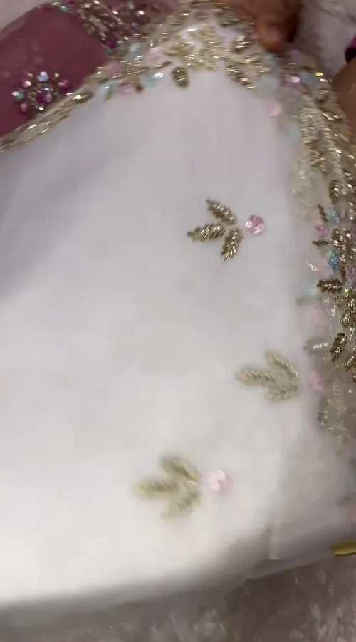 Border Design: Signature hand-embroidered borders featuring multi-colored sequins in pastel shades and precision golden zari.