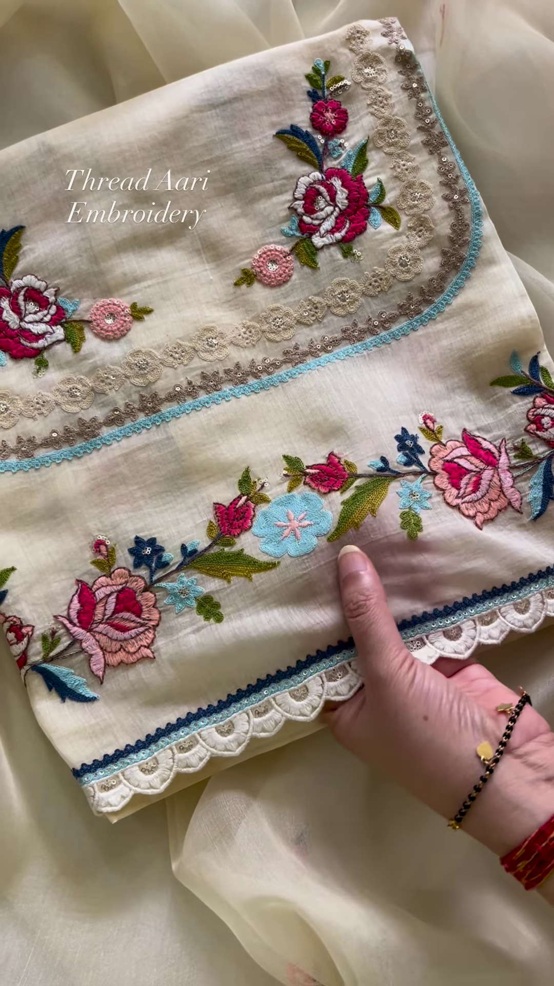 The main piece is a beautiful kurta, featuring a unique and eye-catching neckline. The fabric is a creamy, ethereal shade that offers a clean canvas for the elaborate Aari thread embroidery. This intricate form of needlework is visible around the neck and along the front placket, creating a striking border that frames the face beautifully. The embroidery is done in vibrant yet harmonious colors, including shades of deep blue, magenta, and a soft, rosy pink. The meticulous stitching forms a repeating floral and geometric pattern, adding a layer of texture and visual interest. The neck design is a modern take on a classic silhouette, with a keyhole detail and button embellishments that extend down the front, providing both a stylish and functional element. The main body of the kurta has a subtle, self-textured pattern, giving it a rich, tactile feel that complements the smooth, embroidered borders.