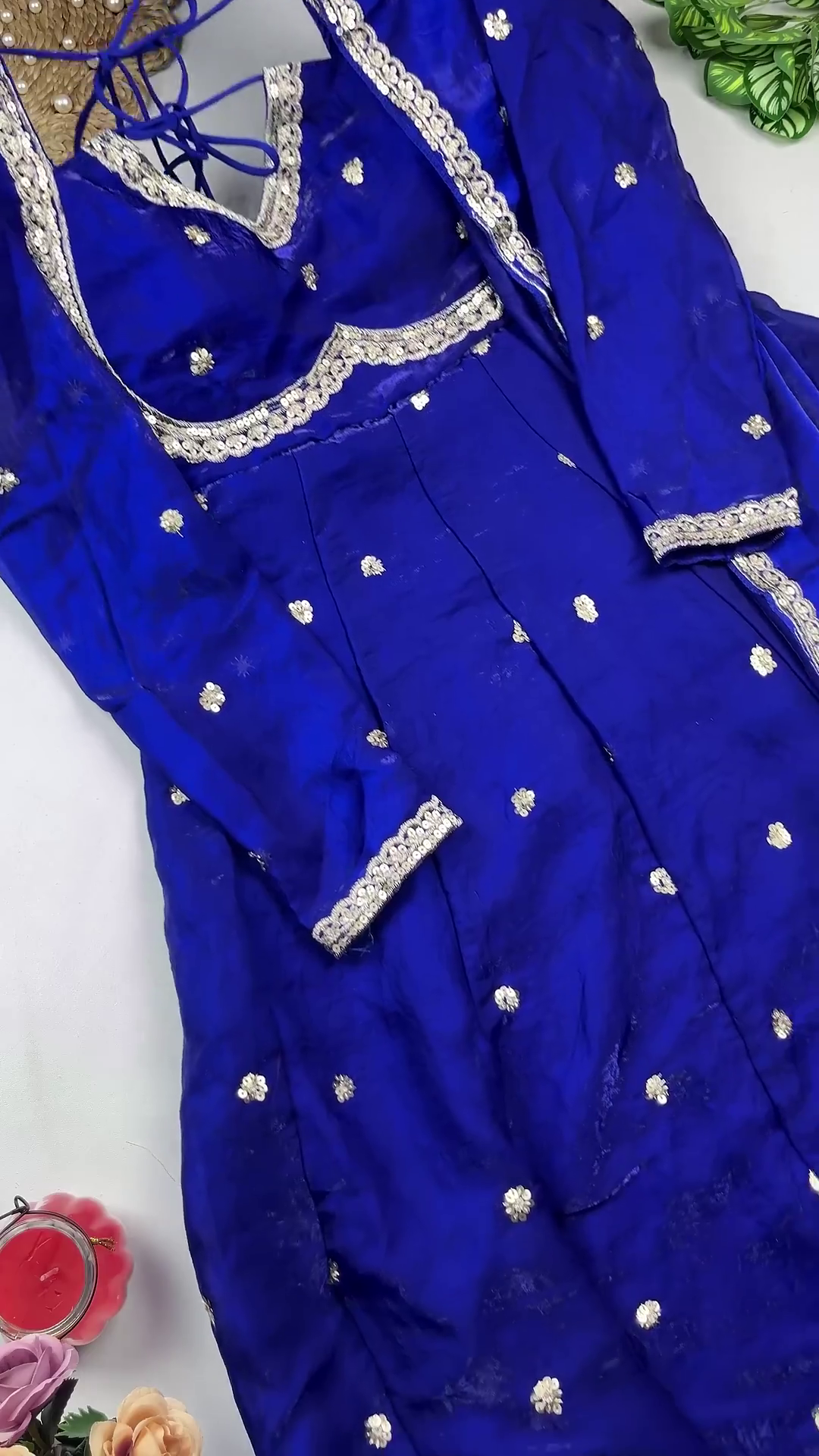Ironing: Use a steamer or a cool iron on the reverse side only; NEVER apply direct heat to the zari or sequined areas.