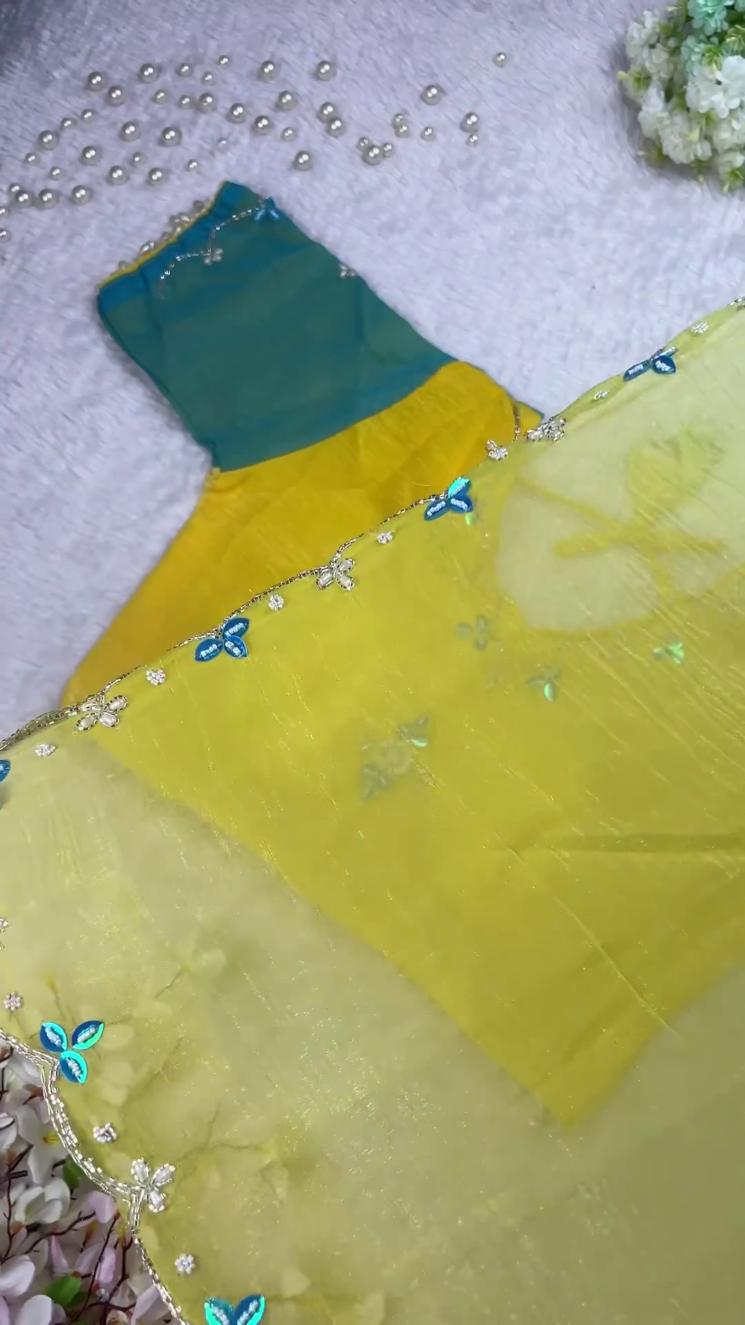 ✔️ Ombre Transition: Showcases the fluid color gradient of the saree fabric that creates a refreshing visual contrast.