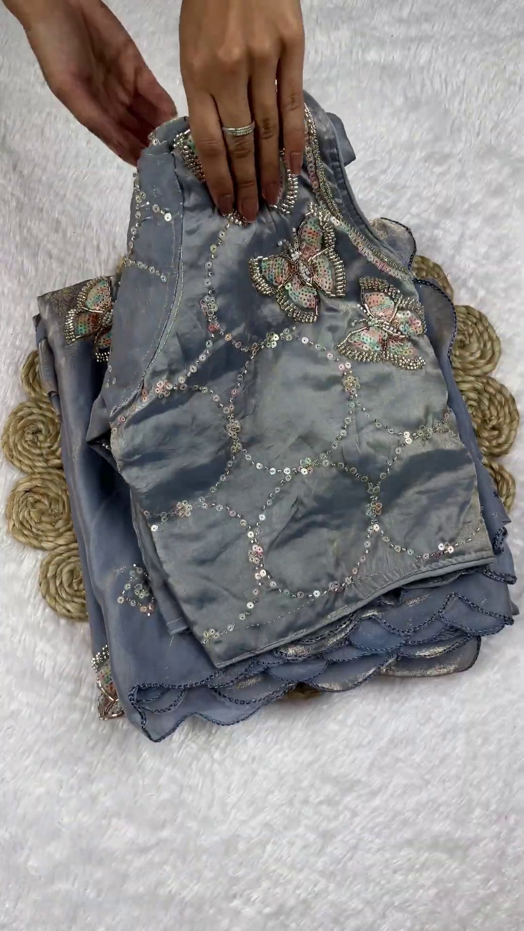 Handle with Care: Be cautious with sharp jewelry that may snag the fine zari thread or mark the delicate velvet surface.