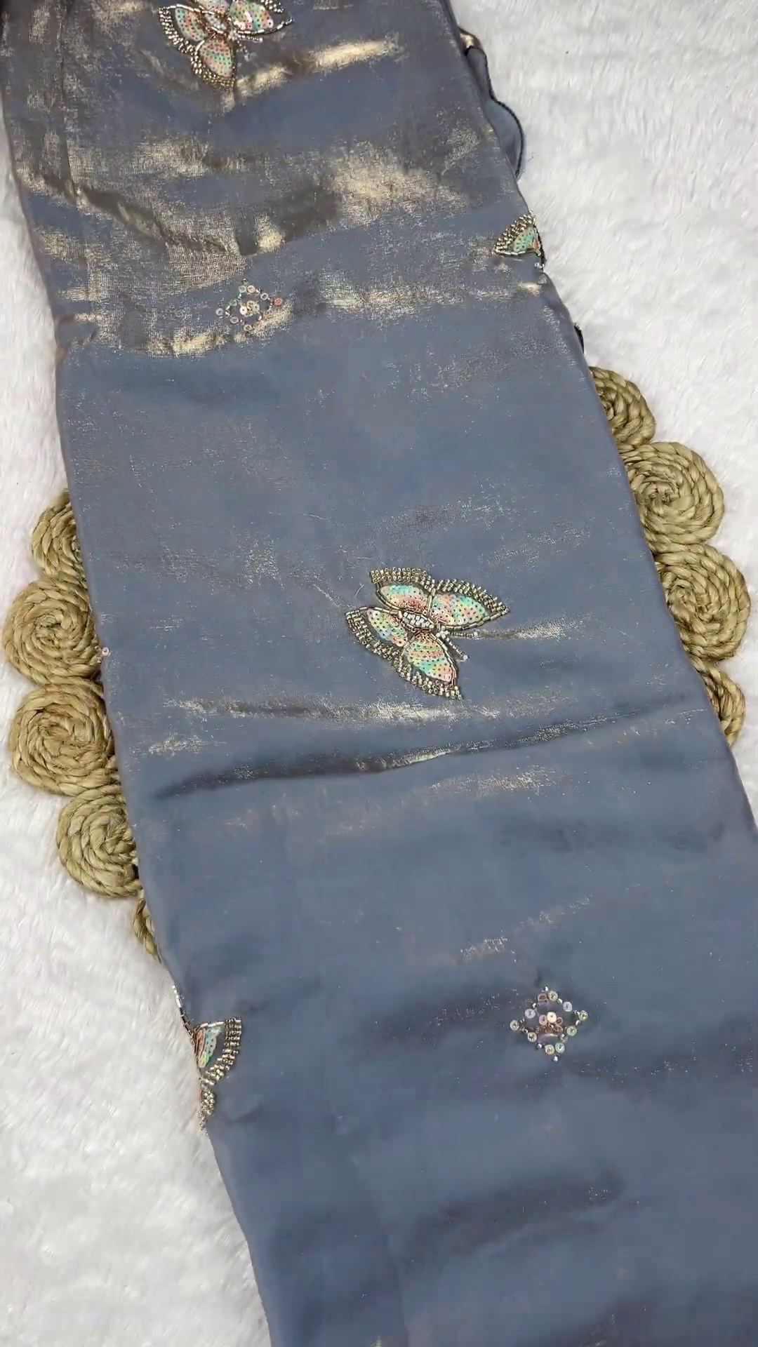 Intricate Zari & Sequin Work: The artisanal embroidery is highlighted with golden zari thread and shimmering sequins that catch the light beautifully.