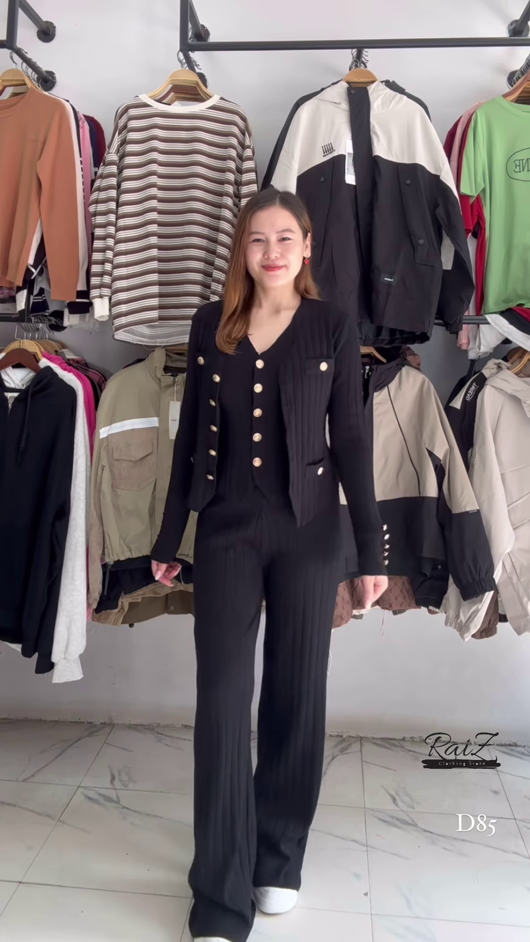 The set includes matching wide-leg knitted trousers that provide a majestic and flowing silhouette. The wide-leg cut is incredibly trendy and offers a comfortable alternative to skinny jeans or leggings. The vertical ribbing on the pants mirrors the cardigan, creating a long, uninterrupted visual line that makes the wearer appear taller and more slender. The fabric has a significant weight to it, ensuring it drapes beautifully without clinging to the body, providing both modesty and style.