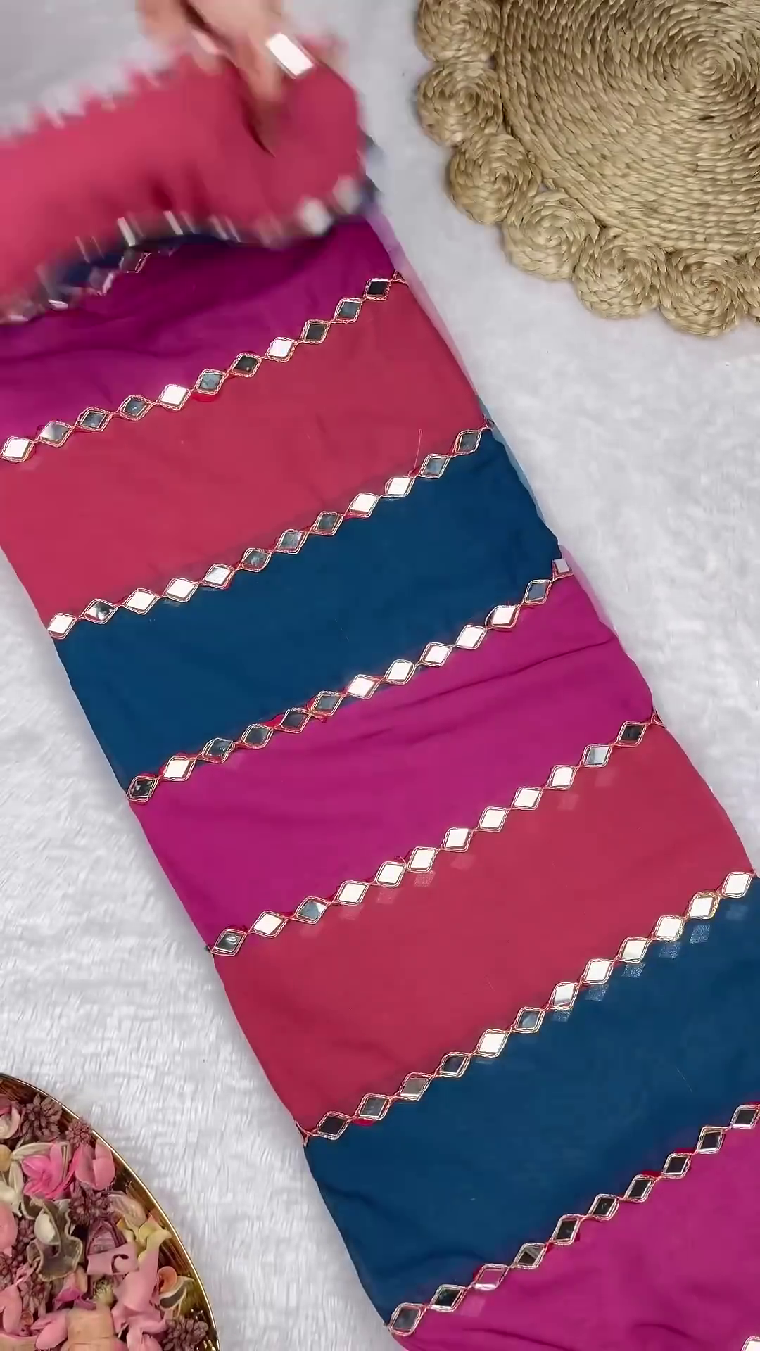 • Pair with a pink and blue ombre georgette saree to complement the vibrant teal hue and mirror-work.