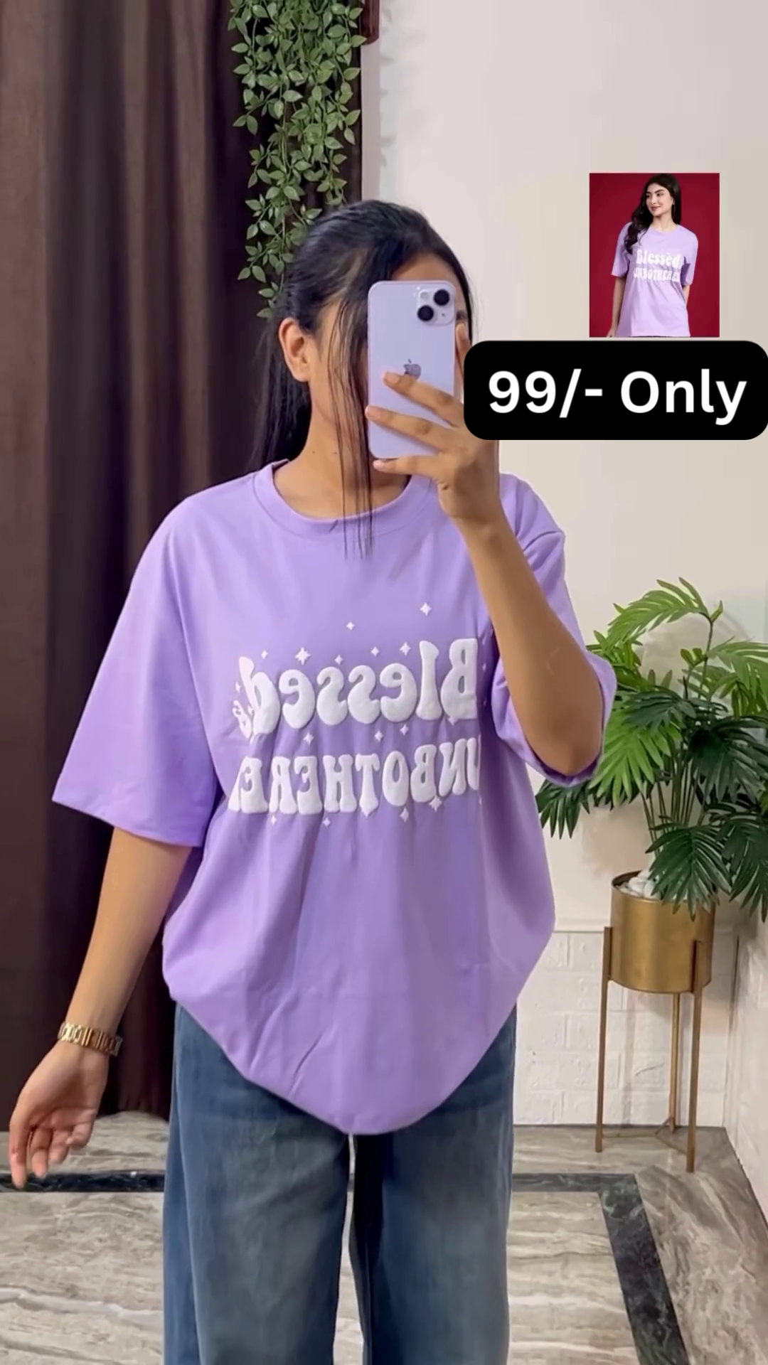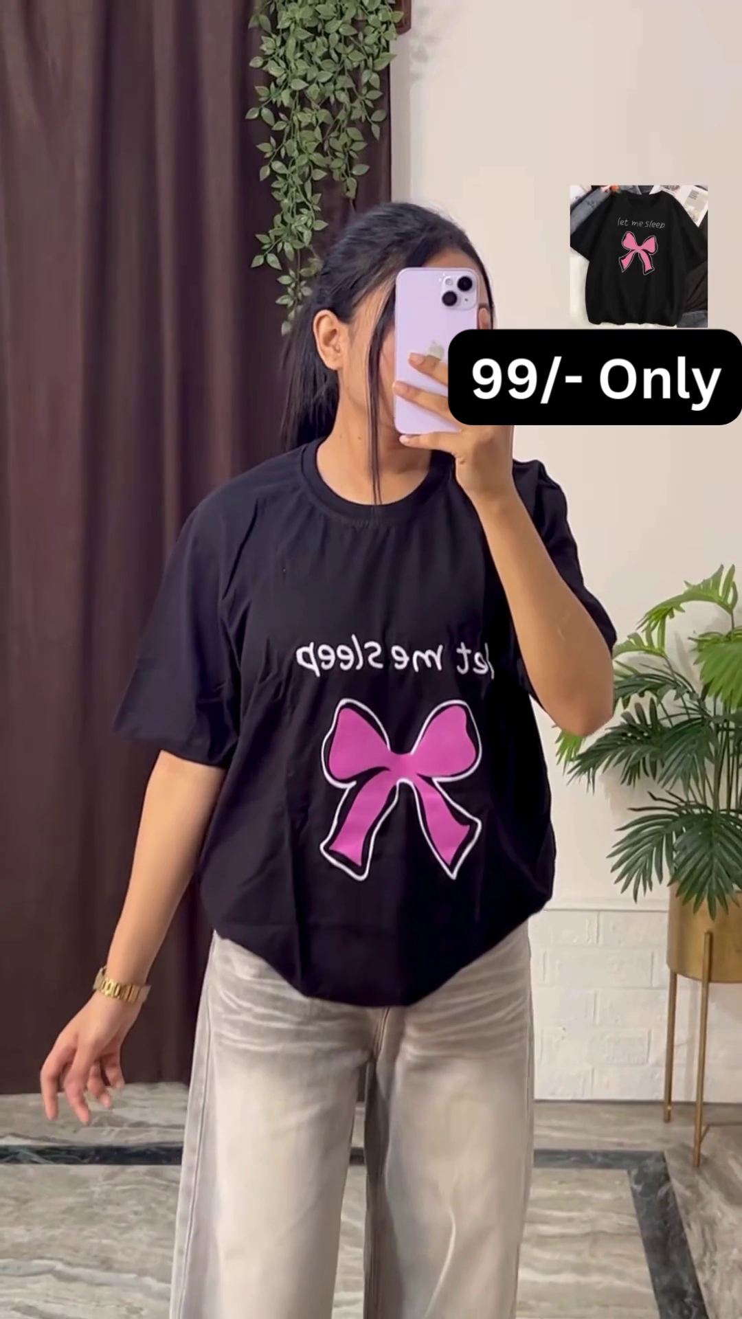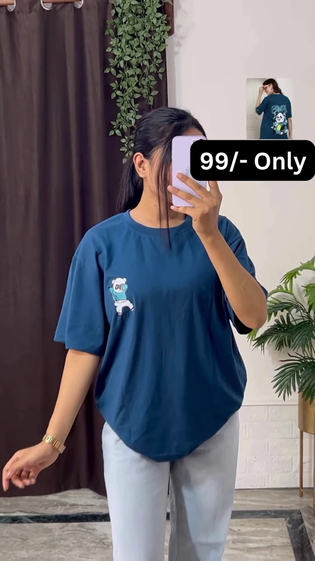 In the image, the woman is holding a light-colored phone, which covers her face, keeping the focus squarely on the clothing and allowing a potential customer to easily envision themselves wearing the outfit. Her accessories are minimal but impactful; she is wearing a gold-toned watch on her wrist, which adds a touch of sophistication to the casual ensemble. The background of the photograph is simple, with dark brown curtains on the left and a green potted plant on the right, providing a natural and pleasing backdrop that doesn’t distract from the product. The bright lighting ensures that all the colors and details of the graphic print are clearly visible, making the shirt look its best. This outfit is a perfect example of combining a bold graphic tee with classic casual pieces to create a fashionable and effortless street-style look.