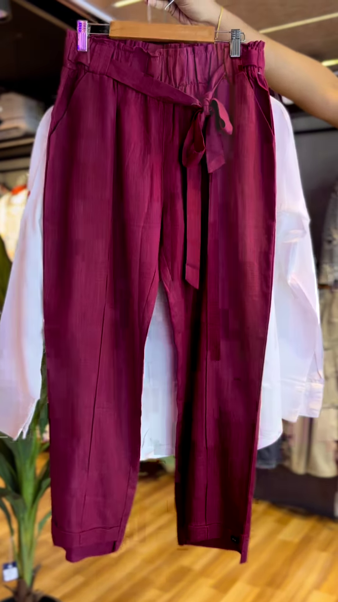 Bottom Wear: Straight-leg maroon pants for a stylish coordinated look